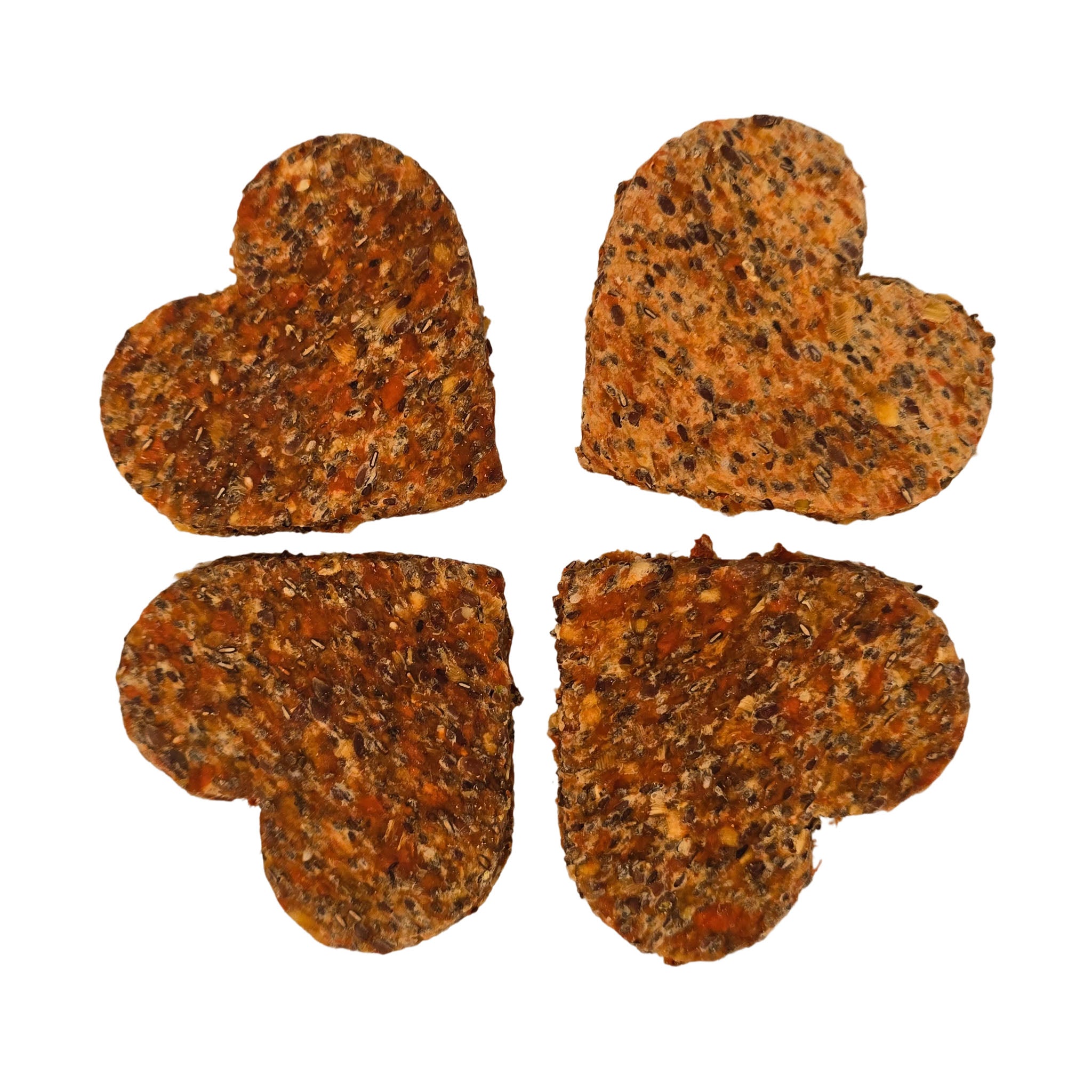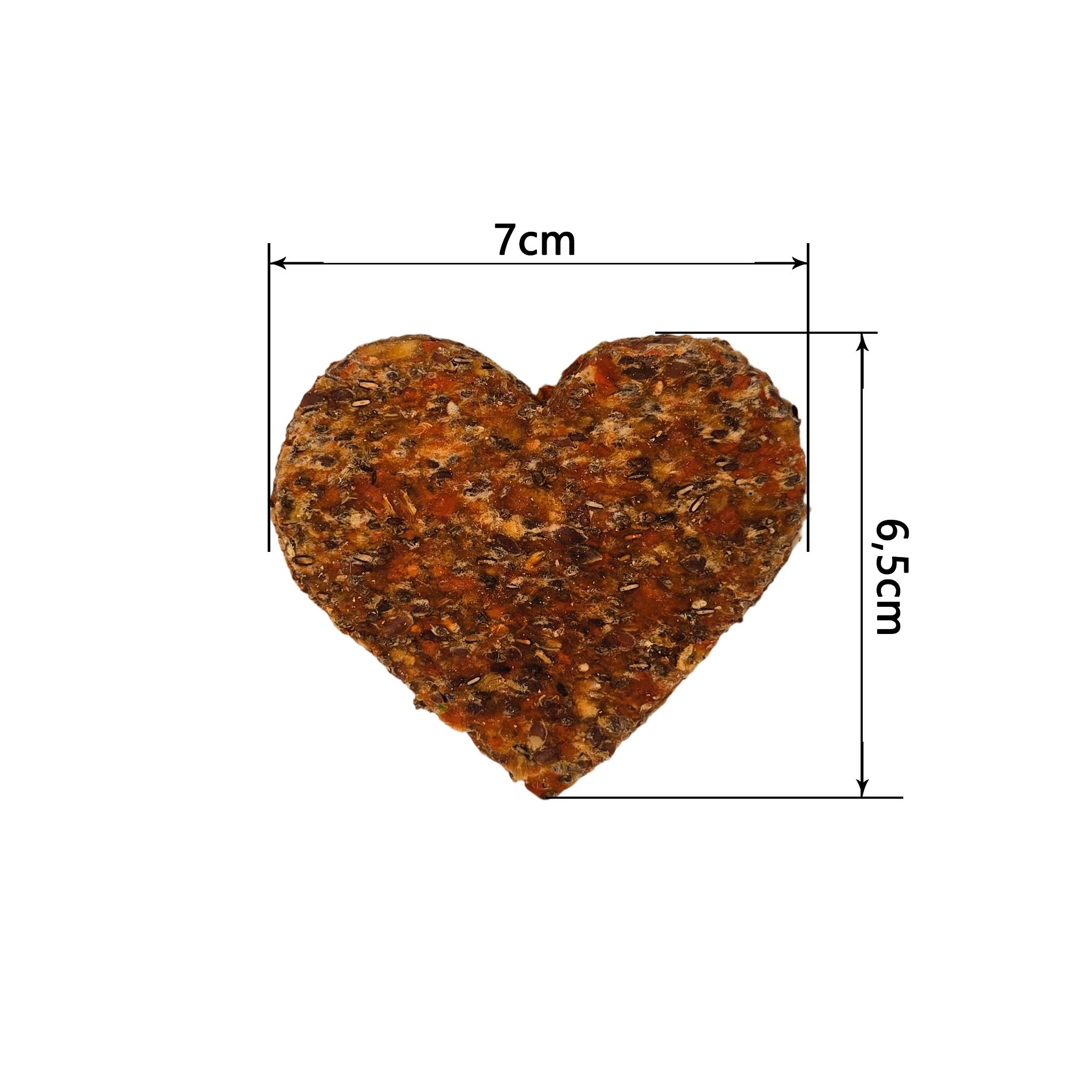 Es muss nicht immer Fleisch sein. Unsere veganen Veggieherzen sind ein sehr beliebter Kausnack. Viel gesundes Gemüse und Samen, das ganz besonders toll für Fell und Haut ist. Alle Zutaten werden in Form eines Herzens gepresst. Dieser hat eine Größe von ca. 7cmx6,5cm . Er wird bei allen Hunden gut angenommen. Egal ob Welpe oder Senior, die Veggieherzen sind gut zu kauen ohne schnell verschlungen zu werden. Als fettarmer, gesunder Snack für Zwischendurch oder als Belohnung.